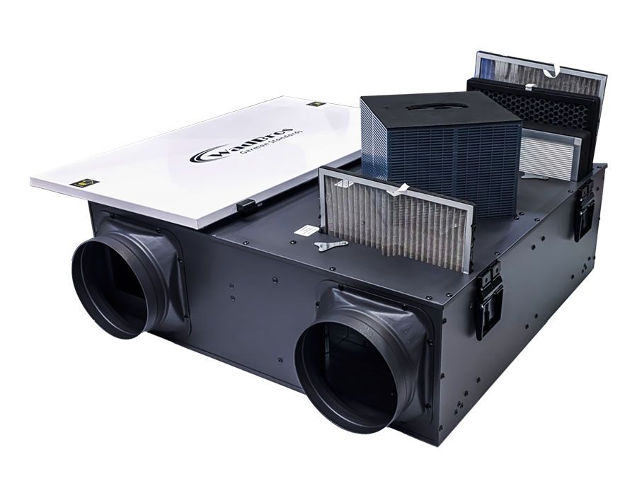 ERV (Energy Recovery Ventilator) An ERV (Energy Recovery Ventilator) by Wadbros provides smart ventilation by exchanging stale indoor air with fresh outdoor air while conserving energy. It efficiently recovers heat and moisture, maintaining comfortable indoor temperatures and reducing energy costs. Ideal for homes, offices, and commercial spaces, it improves air quality, removes pollutants, and balances humidity levels. Designed for reliability and long-term performance, the ERV by Wadbros ensures cleaner, healthier air while supporting energy-efficient ventilation for modern living and working environments. • Engineered for pure breathing • Exhaust and fresh air supply feature enabled in a single unit • Three stage filtration: Mesh Filter for dust, Activated Carbon for odour, HEPA Filter for PM 2.5, finer allergens and microbes • Energy recovery from the airstream • Real-time display of common pollutants like VOC • Auto-mode operation upon detection of pollutants above safe limit • Temp & Humidity (RH) Display, Time & Day Display • Auto & manual fan speed-control • 4 modes - Auto, Manual, Timer and Sleep • Child-lock screen • App control with WIFI connectivity
